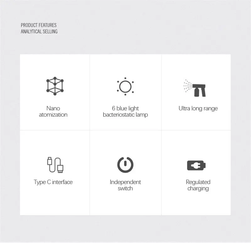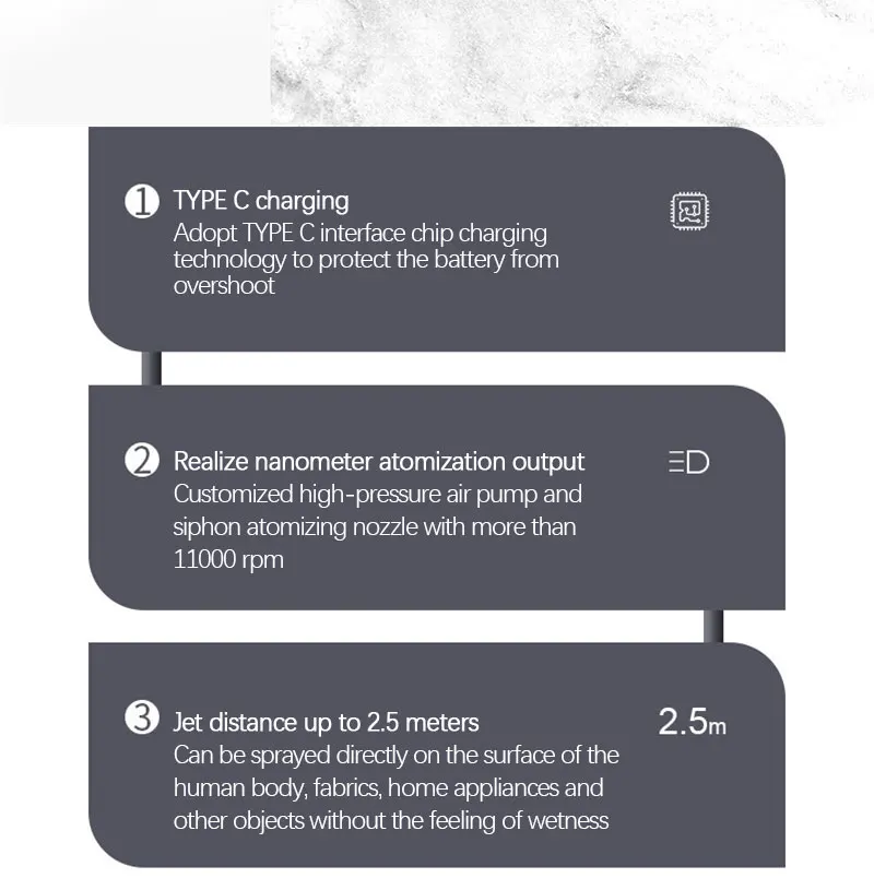 The spraying distance is up to 2.5 meters, and it can be sprayed directly on the surface of the human body, fabrics, home appliances and other objects without the feeling of being wet.