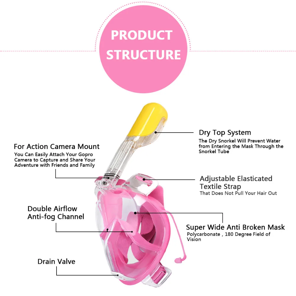 Description: Is snorkeling uncomfortable for you? Do you hate breathing through a tube in your mouth? This full dry snorkeling mask set is the best choice for you! It offers a unique diving experience to users allowing them to capture every breath-taking underwater scenery. The innovative dry top technology enables you to breathe freely underwater. Full face with detachable snorkel design and tempered glass with 180-degree provide better protection for your face with wider underwater views. It is the best mask for you to enjoy your diving experiences! Features: - Drain valve and dry top design for draining away the water by raising up your head when water leaking - Built-in ear plugs design, more convenient to use - Detachable breathing tube design with a storing bag, easy to carry and storage - Equipped with camera mount, easily attached to GoPro camera - High definition, anti-fog, breakage-proof and 180-degree wide view mask - Adjustable elastic fabric headband design, suitable for all kinds of head shape - Suitable for both adults and kids, more practical and useful - Material: liquid silicone and PC - Ideal for diving, swimming, snorkeling and other underwater activities How to Use and Remove Mask: - Put snorkel mask on and place head in water for ensuring no water entering into the mask. - Breathe naturally when the dry top is above water. - Remove the mask by placing your finger into the gap between the mask and your jaw, then push the mask upwards over your face.